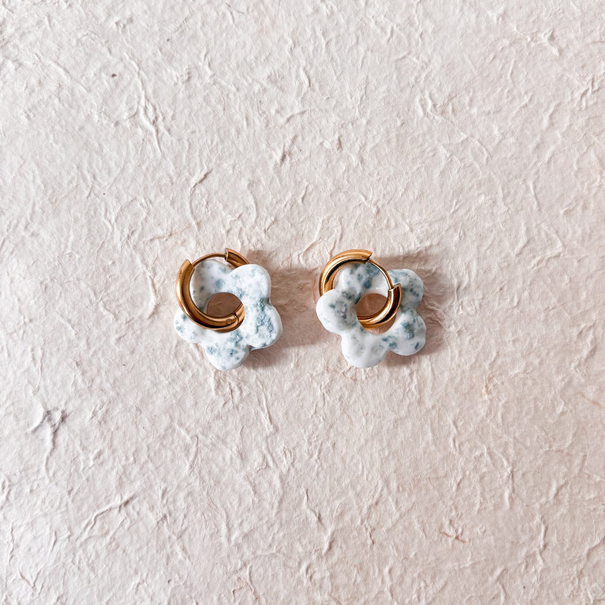 Boucles d’oreilles “Emma” – Porcelaine blanche et bleu canard fleur