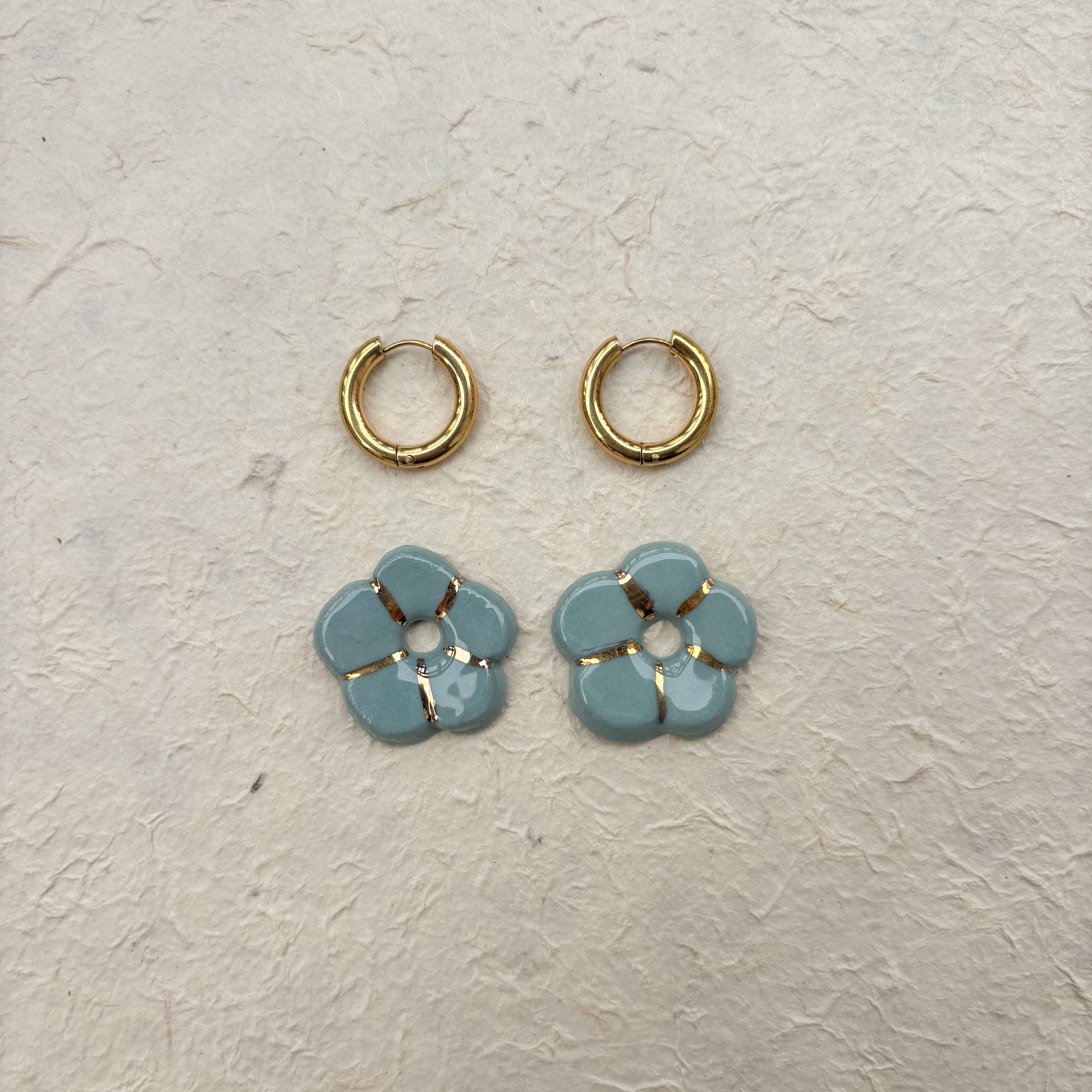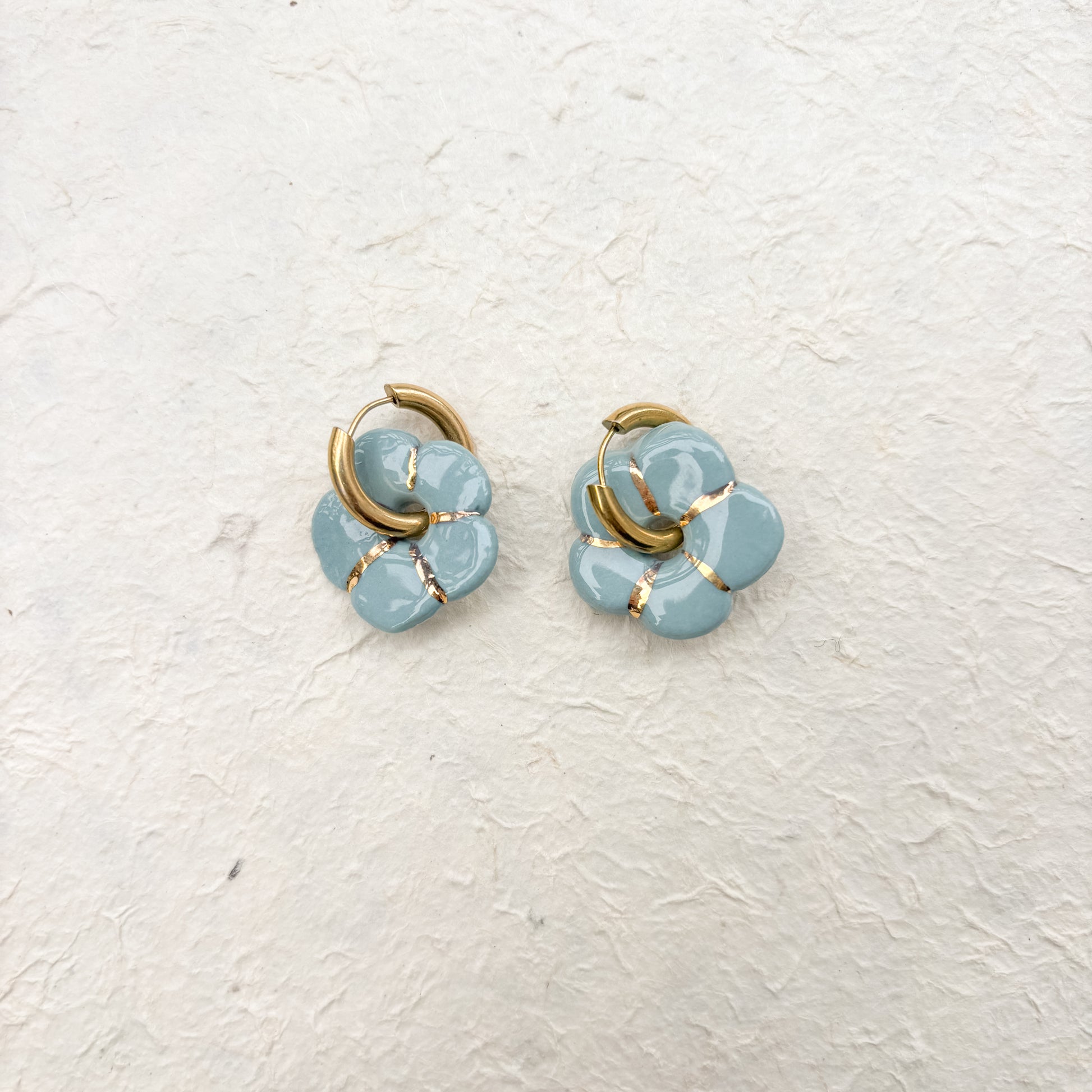 Boucles d’oreilles en porcelaine « Pensée » – Bleu gris et doré